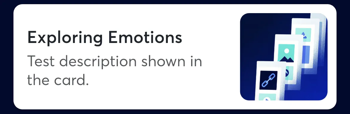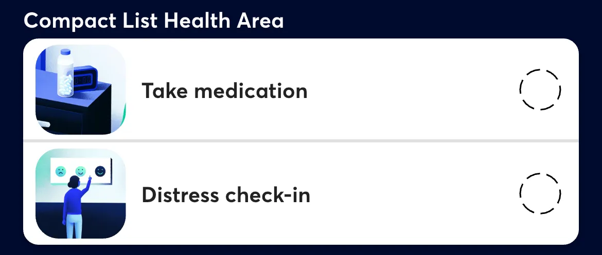 - Slim - side-by-side layout with text on the left and a small square image on the right. Completed cards show a checkmark instead of the description.