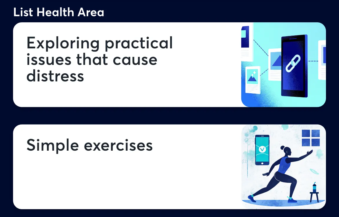 Cards assigned to a health area are grouped under headings showing the health area name, sorted by their configured display order. Within each health area, cards are sorted by the health area's configured sort field and direction.