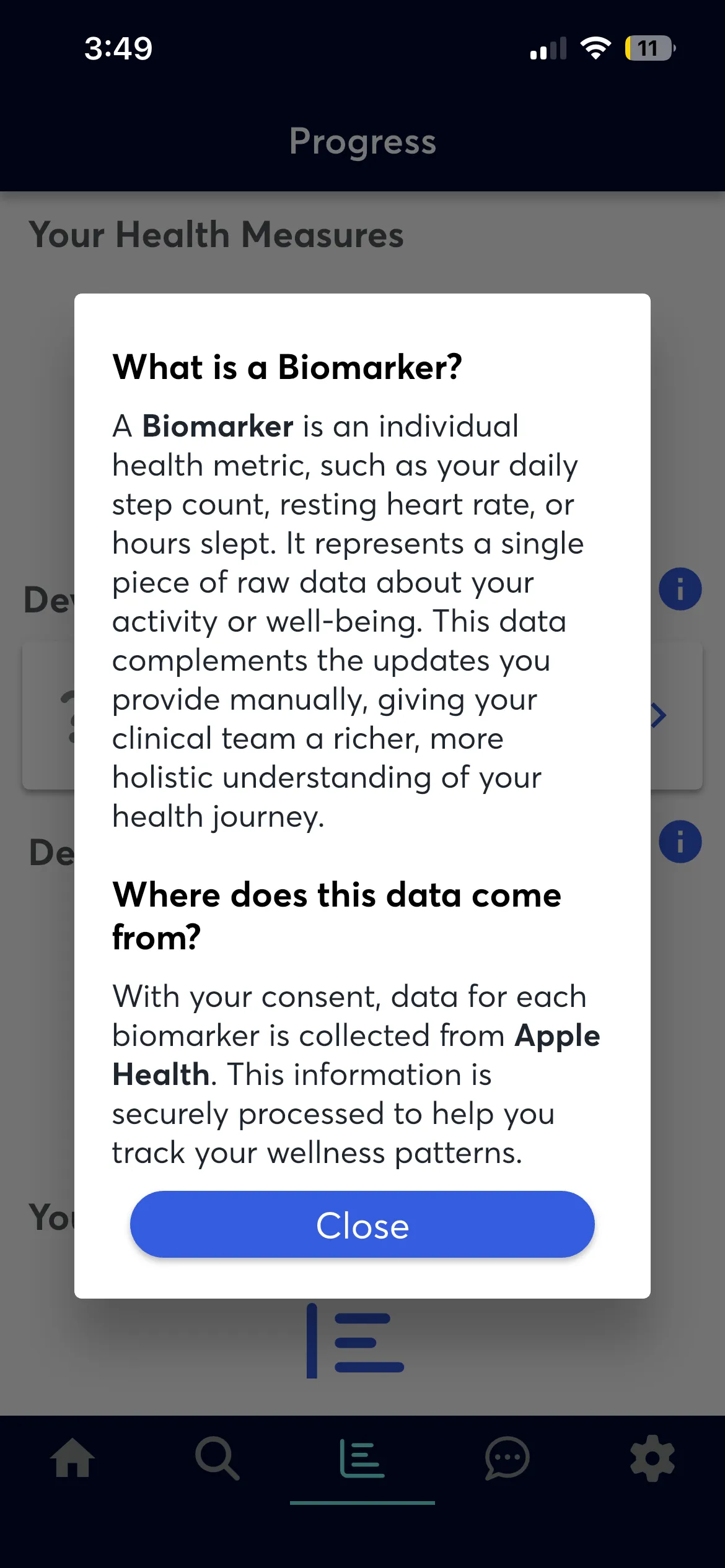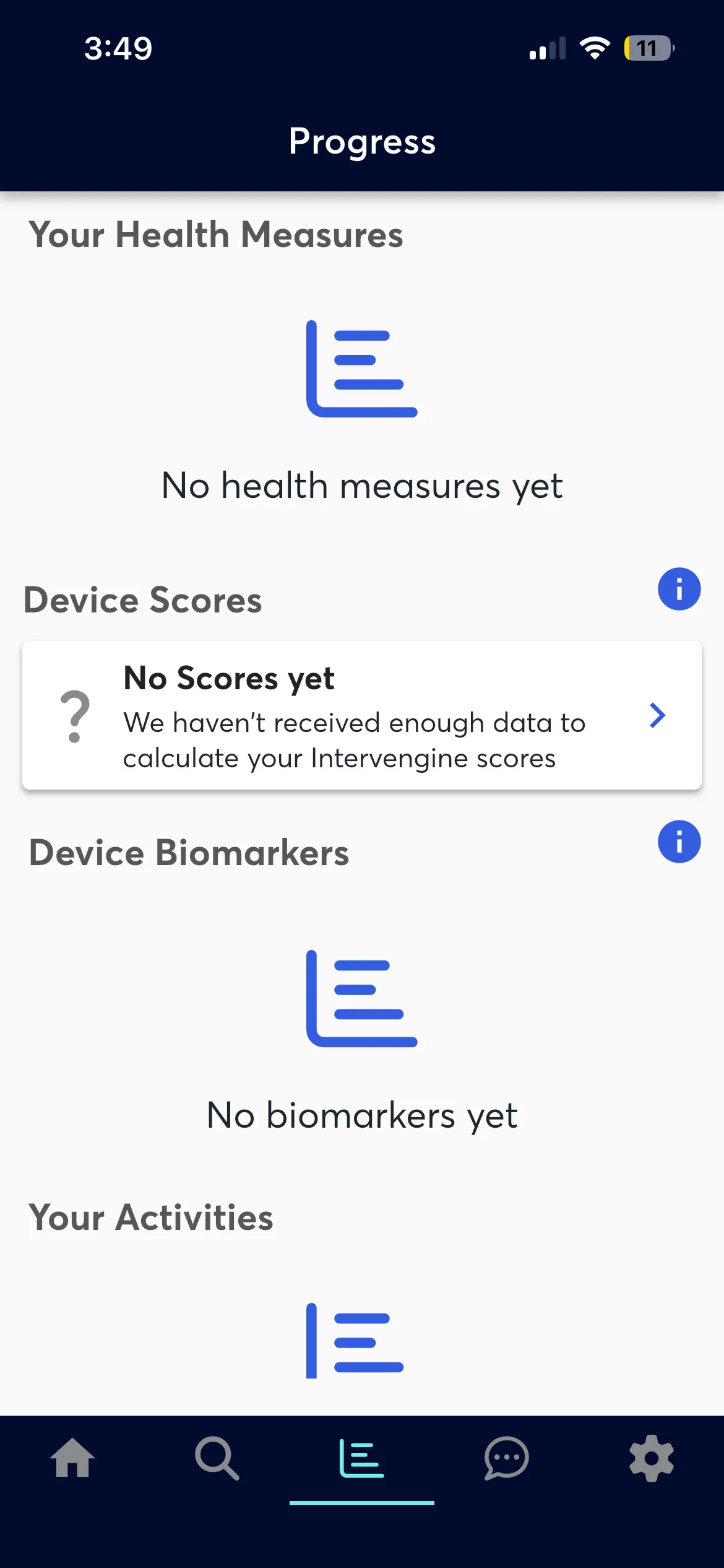 Progress tracks participant health data and activity results across four sections. See the Configuration Reference for chart ordering and date range options.