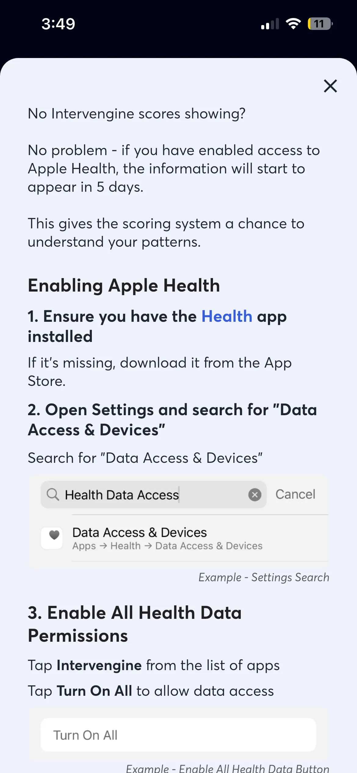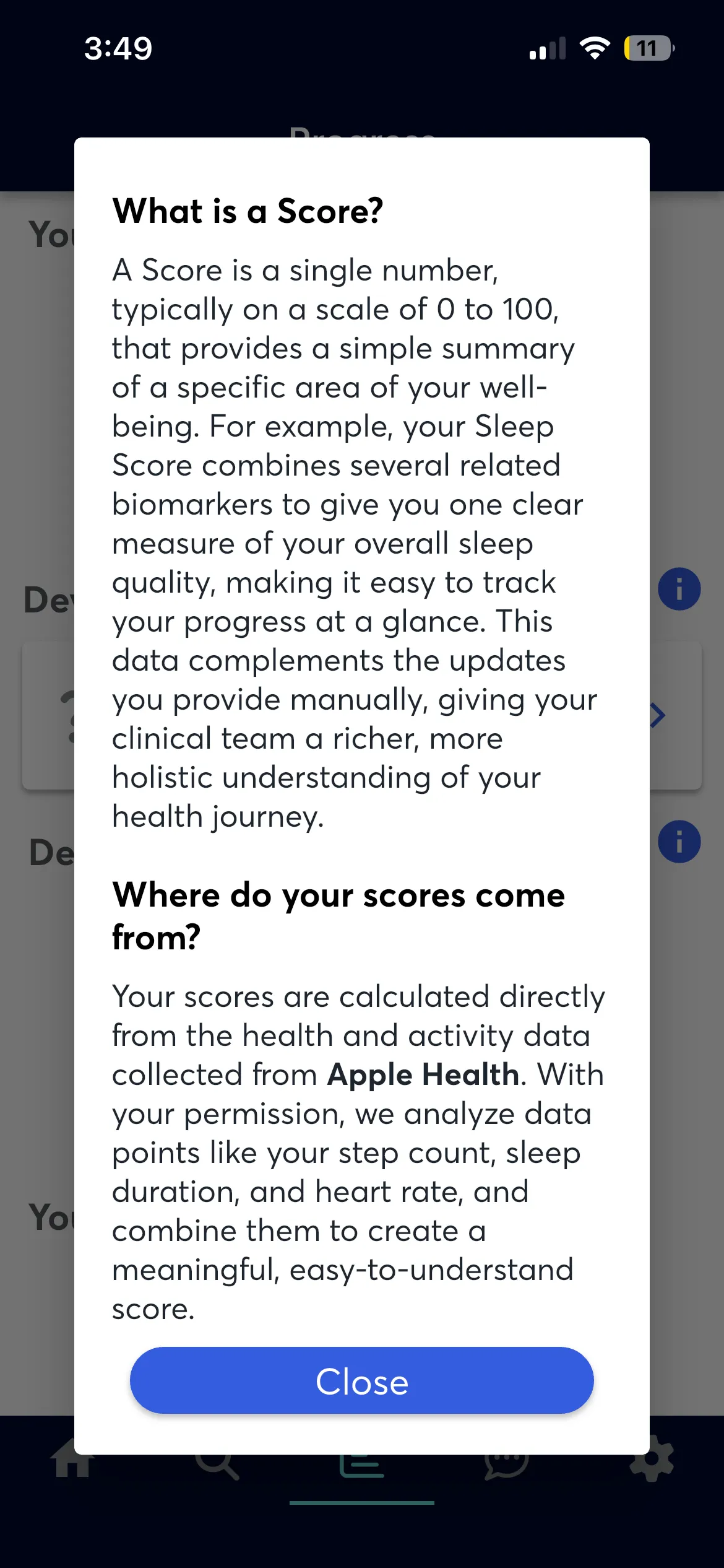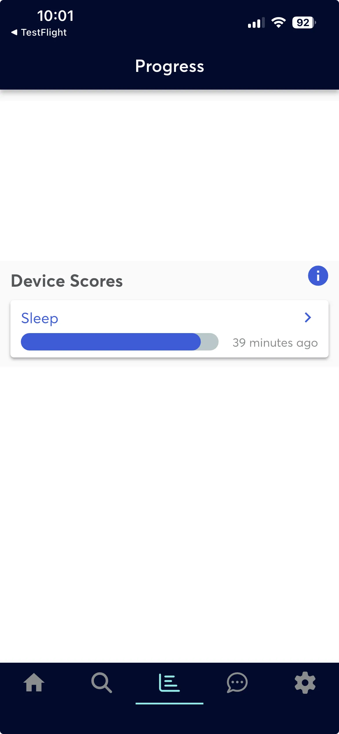 High-level health scores derived from device sensor data, such as overall activity and sleep quality scores. Score modals are displayed using Sahha Widgets - pre-built UI components that render score charts, arcs, and contributing factors directly in the app.