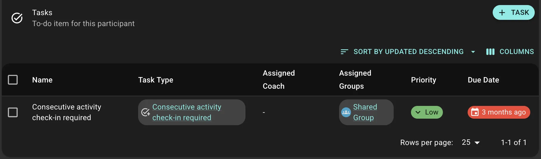 Coaches can create Tasks for scheduling follow-ups, assigning work to team members, or setting reminders.